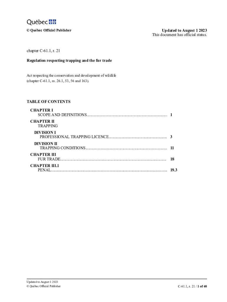 Quebec Official Publisher0 0 8 1 Updated to August 1, 2023, This document has official status. Chapter C61.1, r. 21 Regulation respecting trapping and the fur trade C O Act respecting the conservation