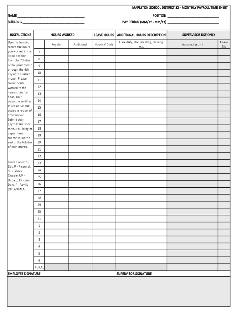 MAPLETON SCHOOL DISTRICT 32 MONTHLY PAYROLL TIME SHEET NAME ___POSITION ___BUILDING ___PAY PERIOD (MM/YY MM/YY) ___INSTRUCTIONS Use this form to record the hours you worked in the listed position