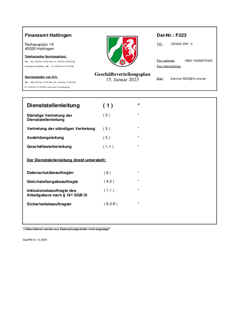 Finanzamt HattingenDstNr.: F323Rathausplatz 19 45525 HattingenTel.:(02324) 208 0Telefonische Servicezeiten: Mo. Do. 8:00 bis 18:00 Uhr, Fr. 8:00 bis 16:00 UhrFax national:GrundsteuerHotline, Mo. Fr.