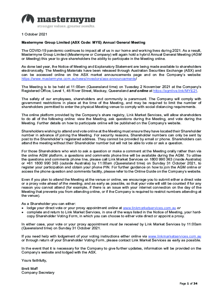 1 October 2021 Mastermind Group Limited (ASX Code: ME) Annual General Meeting The COVID-19 pandemic continues to impact all of us in our home and working lives during 2021. As a result, Mastermind