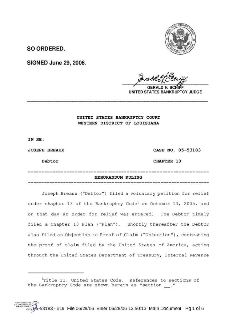 SO ORDERED. SIGNED June 29, 2006.___ GERALD H. SCHIFF UNITED STATES BANKRUPTCY JUDGE___UNITED STATES BANKRUPTCY COURT WESTERN DISTRICT OF LOUISIANAIN RE: JOSEPH BREAUX DebtorCASE NO. 0553183 CHAPTER
