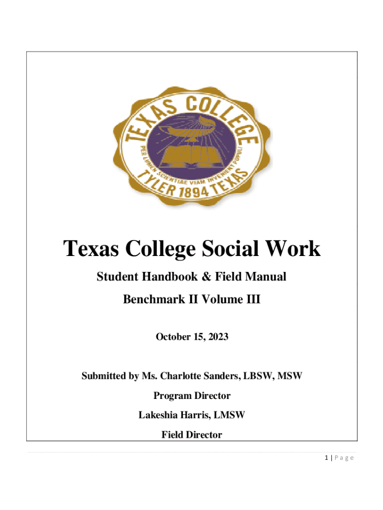 Texas College Social Work Student Handbook & Field Manual Benchmark II Volume III October 15, 2023Submitted by Ms. Charlotte Sanders, LBSW, MSW Program Director Lakeshia Harris, LMSW Field Director