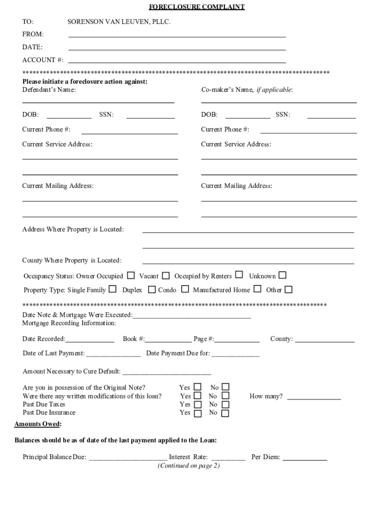 FORECLOSURE COMPLAINT TO:SORENSON VAN LEUVEN, LLC.FROM: DATE: ACCOUNT #: ****************************************************************************************** Please initiate a foreclosure action