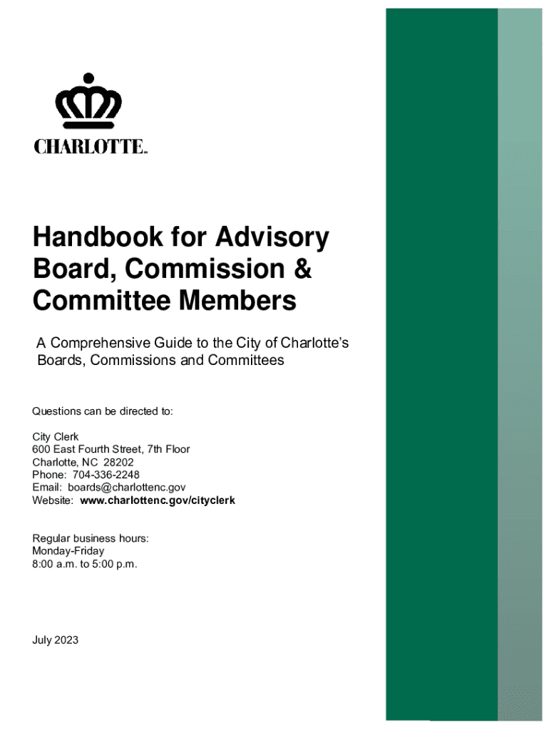 Handbook for Advisory Board, Commission & Committee Members A Comprehensive Guide to the City of Charlottes Boards, Commissions and Committees Questions can be directed to: City Clerk 600 East Fourth