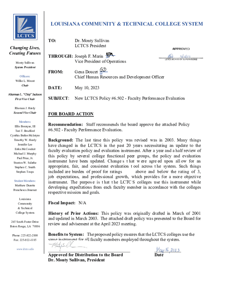 New LCTCS Policy 6502Faculty outlines the guidelines and requirements for faculty evaluation and performance assessments within the Louisiana Community and Technical College System.