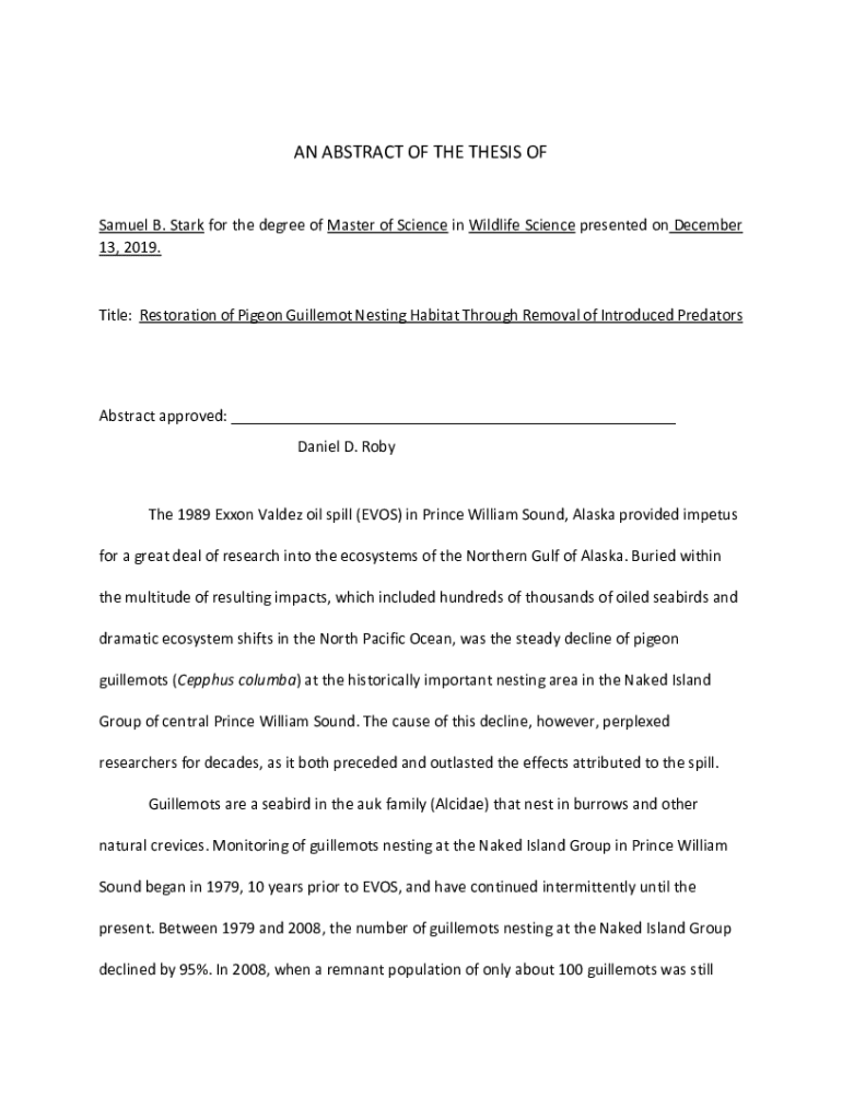ANABSTRACTOFTHETHESISOF Samuel. StarkforthedegreeofMasterofScienceinWildlifeSciencepresentedonDecember 13, 2019. Title:RestorationofPigeonGuillemotNestingHabitatThroughRemovalofIntroducedPredators