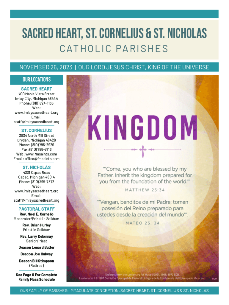 Sacred Heart, St. Cornelius & St. Nicholas C AT H O L I C P A R I S H E S NOVEMBER 26, 2023 | OUR LORD JESUS CHRIST, KING OF THE UNIVERSE OUR LOCATIONS SACRED HEART700 Maple Vista Street Inlay City,