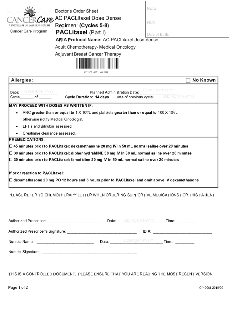 Name:Doctors Order SheetCancer Care ProgramAC Dose Dense Regimen: (Cycles 58) (Part I)HCN: Date of Birth:ARIA Protocol Name: ACPACLitaxel dosedenseAdult Chemotherapy Medical Oncology Adjuvant Breast