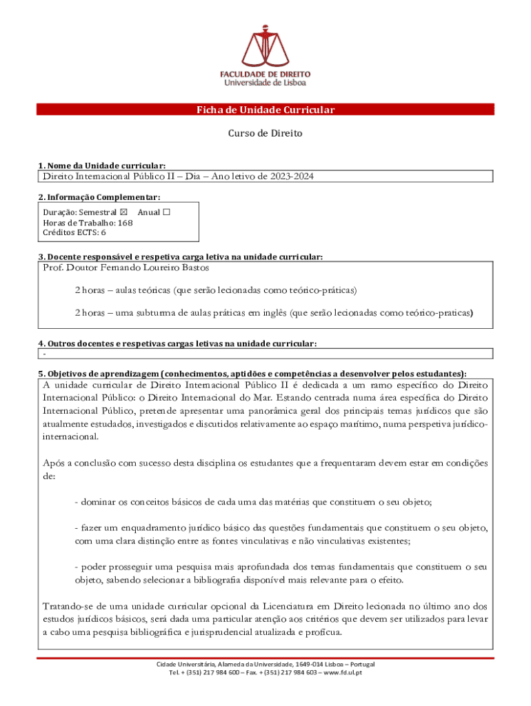 Obtenha o gratuito Ficha de unidade curricular Curso de Direito
