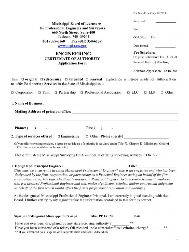 INSTRUCTIONS FOR COMPLETING THE ENGINEERING CERTIFICATE OF AUTHORIZATION APPLICATION FORM (10/19)Code Authority Mississippi Code 73133 provides that as of January 1, 2005, a Certificate of Authorization