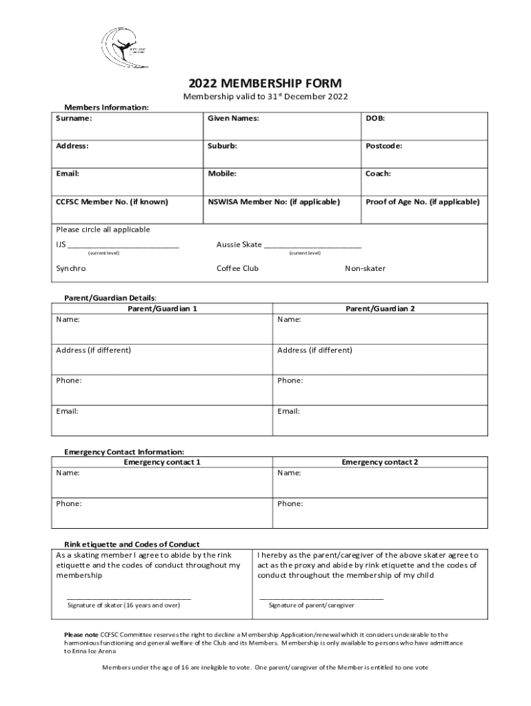 2022 MEMBERSHIP Remembers Information: Surname:Membership valid to 31st December 2022 Given Names:DOB:Address:Suburb:Postcode:Email:Mobile:Coach:CC FSC Member No. (if known)NSW ISA Member No: (if