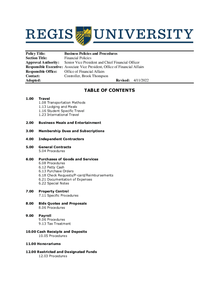 Policy Title: Section Title: Approval Authority: Responsible Executive: Responsible Office: Contact: Adopted:Business Policies and Procedures Financial Policies Senior Vice President and Chief Financial