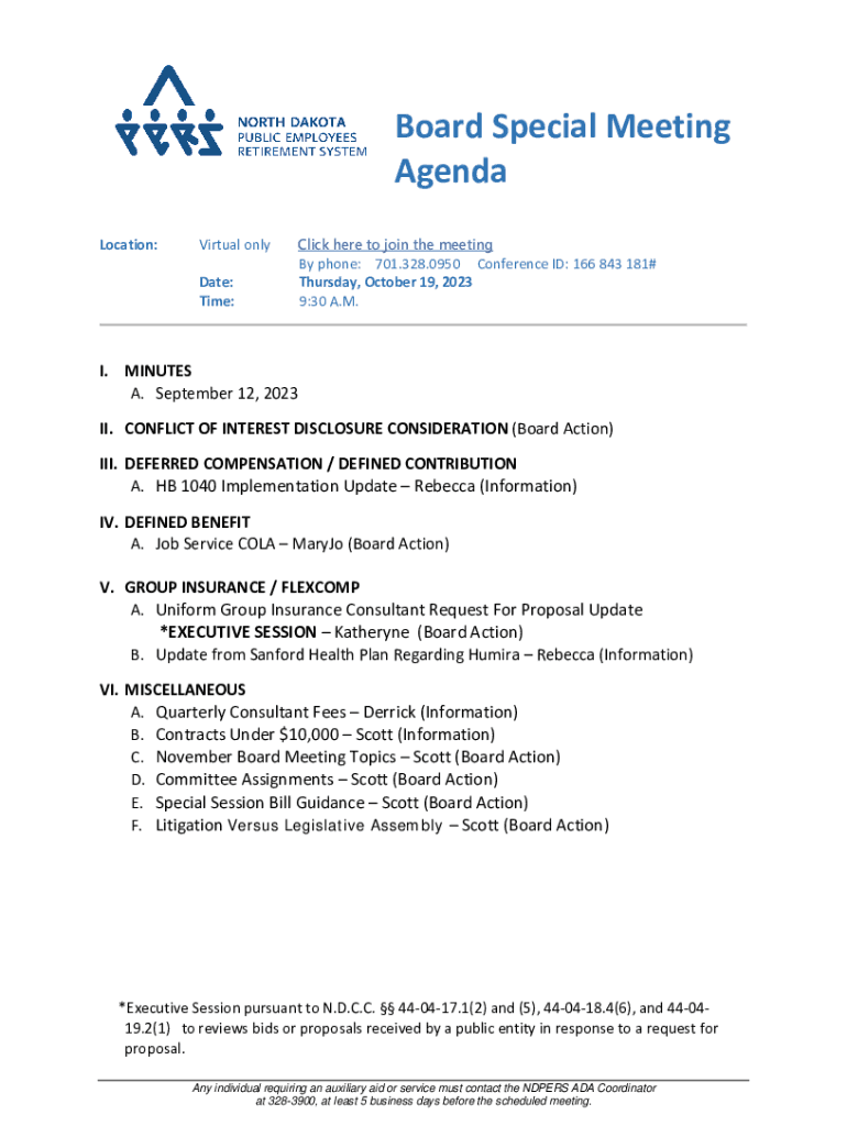Board Special Meeting Agenda Location:Virtual only Date: Time:Click here to join the meeting By phone: 701.328.0950 Conference ID: 166 843 181# Thursday, October 19, 2023 9:30 A.M.I. MINUTES A. September
