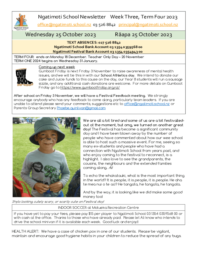 office@ngatimoti.school.nz 03 526 8842 principal@ngatimoti.school.nzWednesday 25 October 2023Rapa 25 October 2023TEXT ABSENCES: 027 526 8842