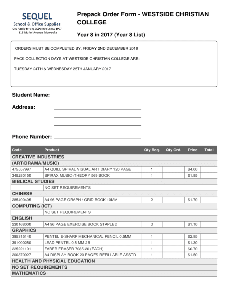 Prepack Order Form WESTSIDE CHRISTIAN COLLEGE Year 8 in 2017 (Year 8 List) ORDERS MUST BE COMPLETED BY: FRIDAY 2ND DECEMBER 2016 PACK COLLECTION DAYS AT WESTSIDE CHRISTIAN COLLEGE ARE: TUESDAY 24TH