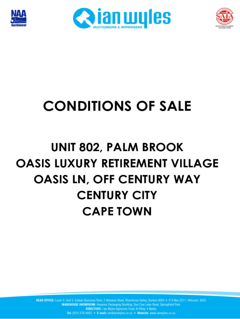 CONDITIONS OF SALE UNIT 802, PALM BROOK OASIS LUXURY RETIREMENT VILLAGE OASIS LN, OFF CENTURY WAY CENTURY CITY CAPE TOWNPINEO, DEIRDRECONDITIONS OF SALE ON REGISTRATION In terms of whichIAN WYLES