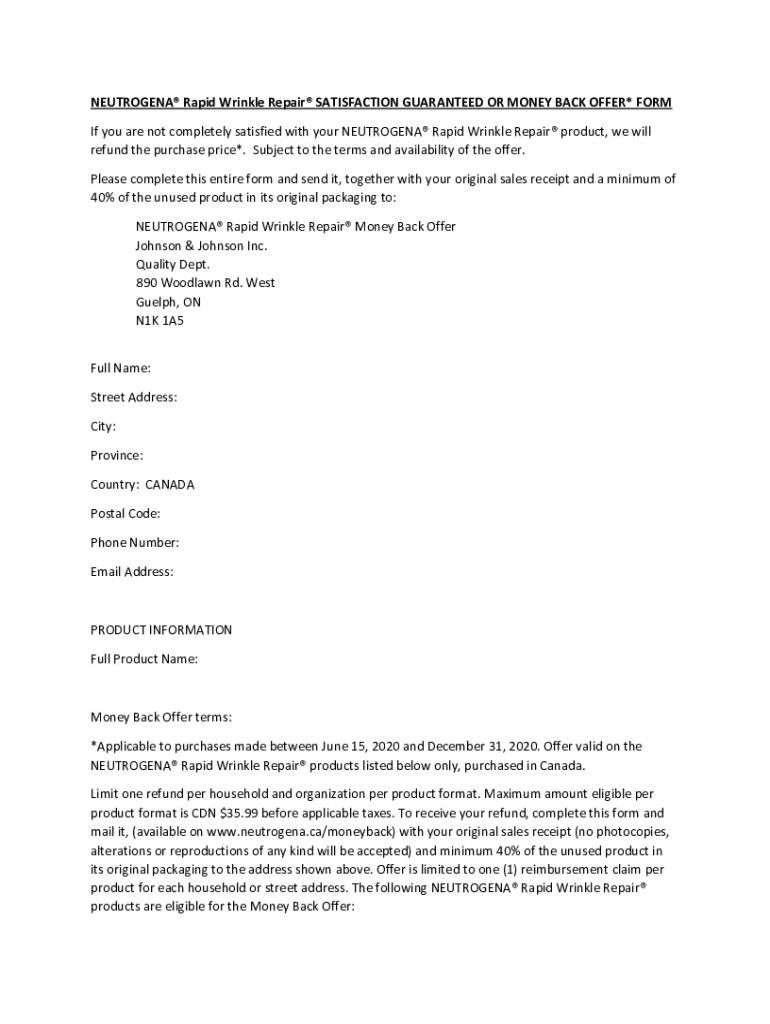 NEUTROGENA Rapid Wrinkle Repair SATISFACTION GUARANTEED OR MONEY-BACK OFFER* FORM If you are not completely satisfied with your NEUTROGENA Rapid Wrinkle Repair product, we will refund the purchase