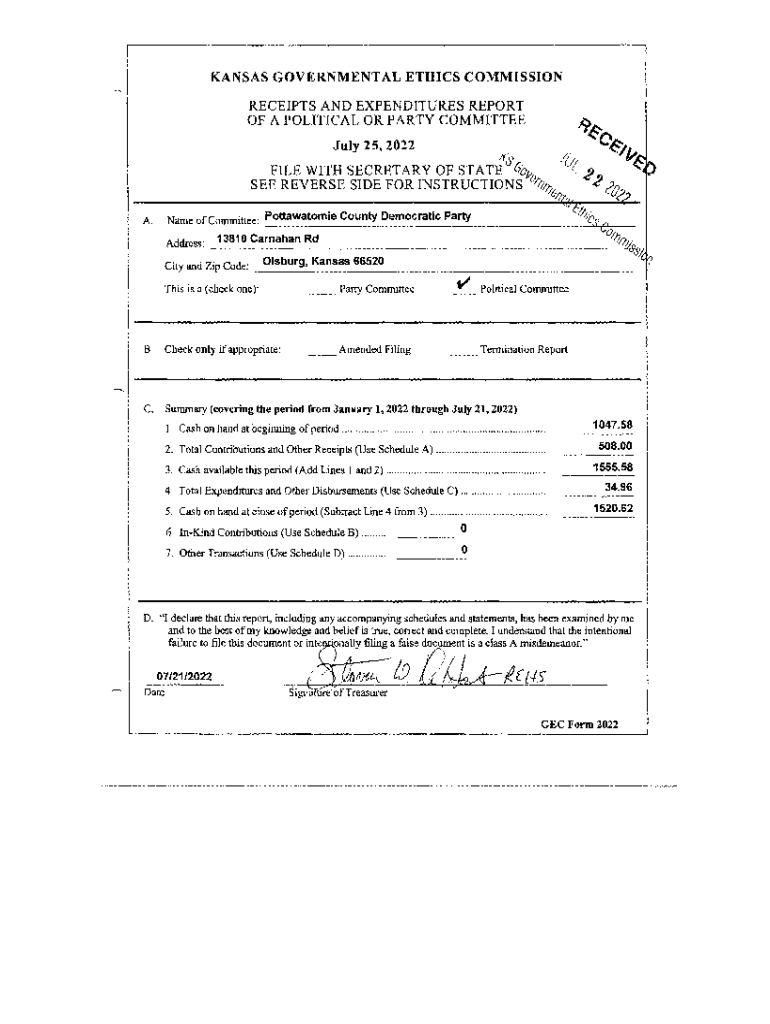 KANSAS GOVERNMENT AL ETHICS COMMISSIONRECEIPTS AND EXPENDITURES REPORT OF A POLITICAL OR PARTY COMMITTEE July 25, 20229.f\'.FILE WITH SECRETARY OF States SEE REVERSE SIDE FOR INSTRUCTIONS i:?,17,113810