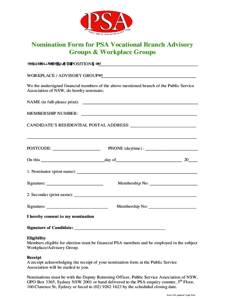 Get the free Nomination Form for PSA Vocational Branch Advisory ...