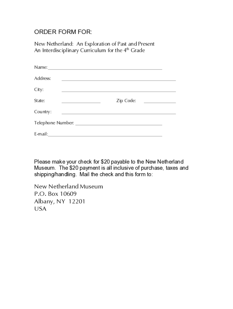 ORDER FORM FOR: New Netherlands: An Exploration of Past and Present An Interdisciplinary Curriculum for the 4th Grade Name:___ Address:___City:___State:___Country:___Zip Code:___Telephone Number: