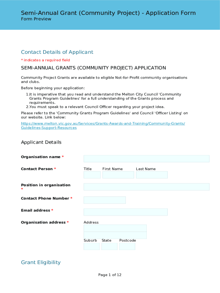 Semiannual Grant (Community Project) Application Form PreviewContact Details of Applicant * indicates a required semiannual GRANTS (COMMUNITY PROJECT) APPLICATION Community Project Grants are available