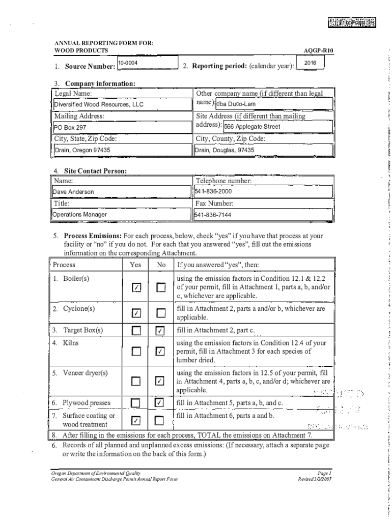 ANNUAL REPORTING FORM FOR: WOOD PRODUCTS1. Source Number:AQGPRlO100004 2016 2. Reporting period: (calendar year): !:e:,::: !::::;:. ormaf10n: 3 C ompany m Legal Name:Other company name (if different