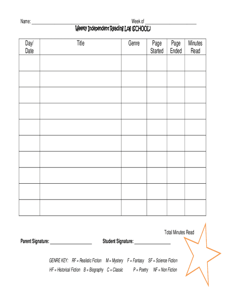 Name: ___ Week of ___ Weekly Independent Reading Log (SCHOOL)Day/ DateTitleGenrePage StartedPage EndedMinutes ReadTotal Minutes Read Parent Signature: ___ GENRE KEY:Student Signature: ___RF Realistic