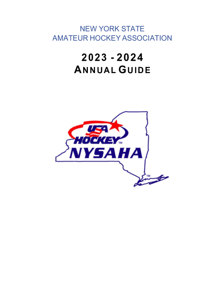 NEW YORK STATE AMATEUR HOCKEY ASSOCIATION2023 2024 ANNUAL GUIDENYSAHA 2023 2024 Calendar August 2023 1 Coaches Certification requirements apply before going on the ice 15 Date for Voter Delegate Allocations