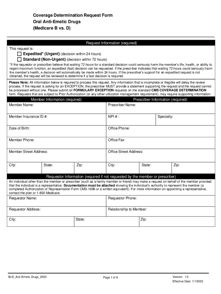 Coverage Determination Request Form Oral AntiEmetic Drugs (Medicare B vs. D) Request Information (required) This request is:Expedited* (Urgent) (decision within 24 hours) Standard (NonUrgent) (decision