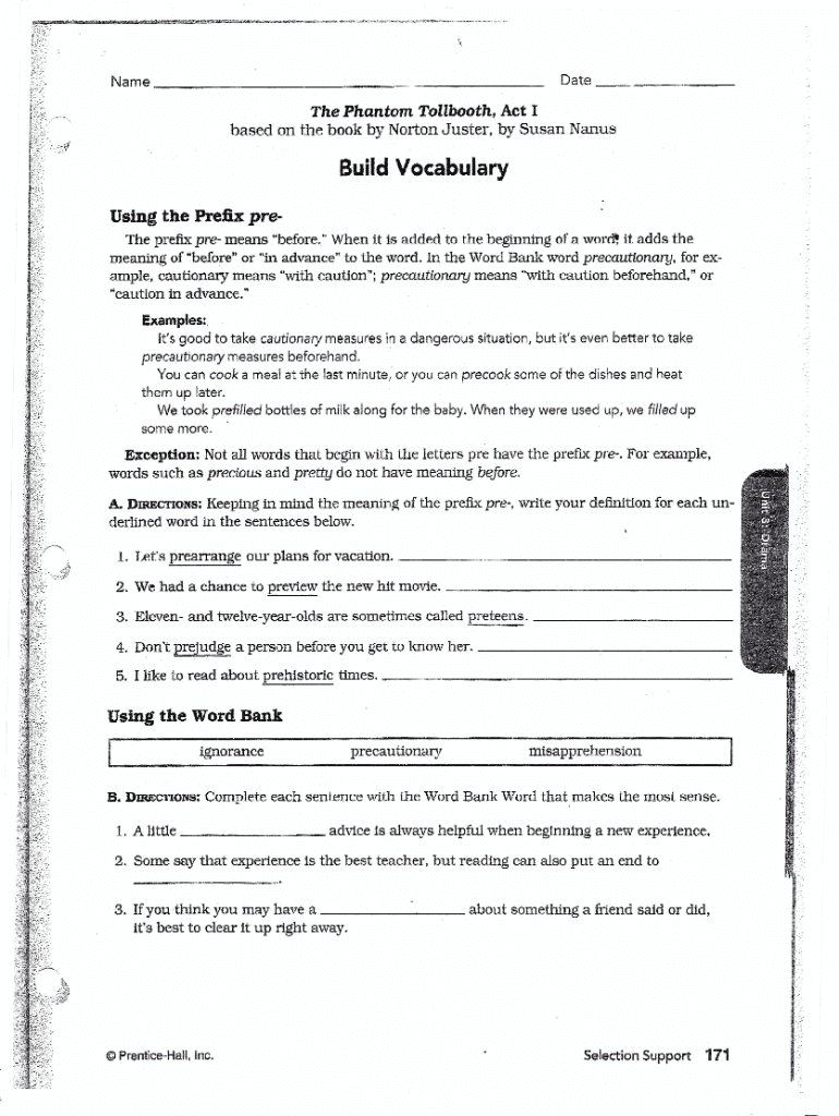Name_Date_The Phantom Tollbooth, Act I based on the book by Norton Juster, by Susan NanusBuild Vocabulary Using the Prefix pretty prefix PRE means \”before.\” When it is added to the beginning
