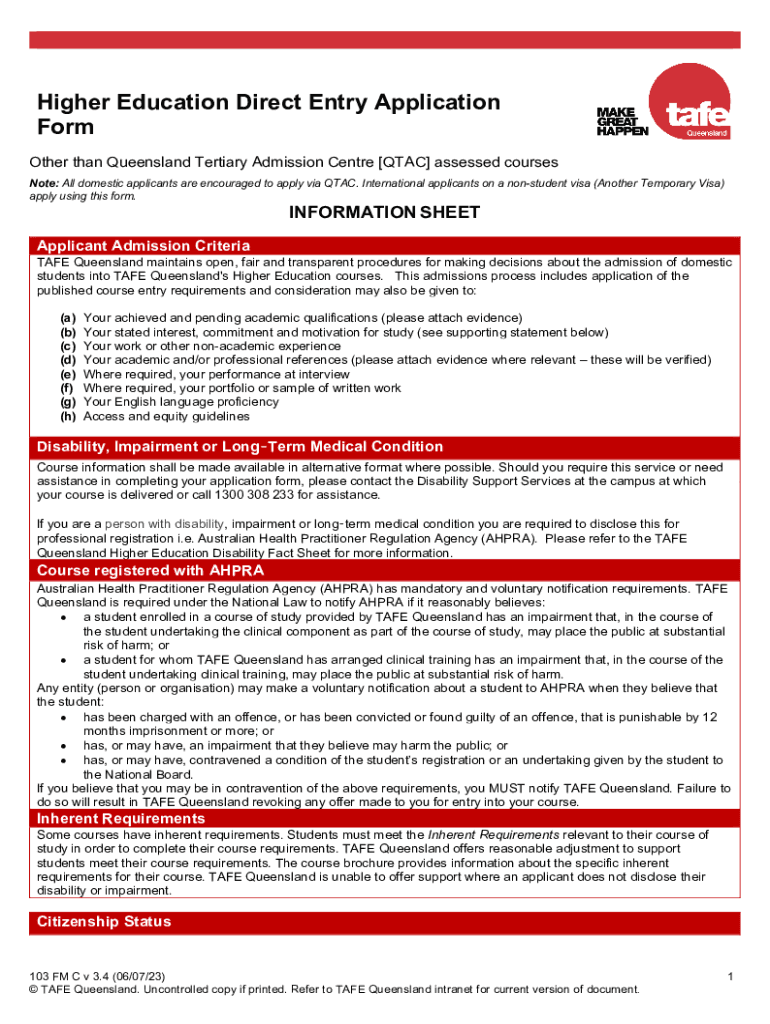 Higher Education Direct Entry Application Form Other than Queensland Tertiary Admission Centre [QTAC] assessed courses Note: All domestic applicants are encouraged to apply via QTAC. International