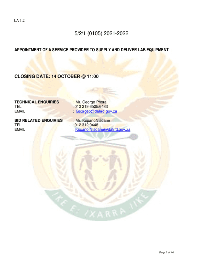LA 1.25/2/1 (0105) 20212022 APPOINTMENT OF A SERVICE PROVIDER TO SUPPLY AND DELIVER LAB EQUIPMENT.CLOSING DATE: 14 OCTOBER @ 11:00TECHNICAL Inquiries TEL EMAIL BID RELATED Inquiries TEL EMAIL: Mr.