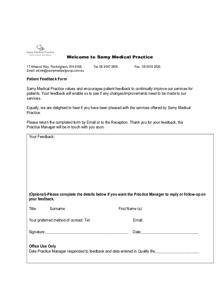Welcome to Same Medical Practice 17 Atwood Way, Rockingham, WA 6168, Email: admin@samymedicalgroup.com.auTel: 08 9557 2600Fax: 08 9518 2826Patient Feedback Form Same Medical Practice values and encourages