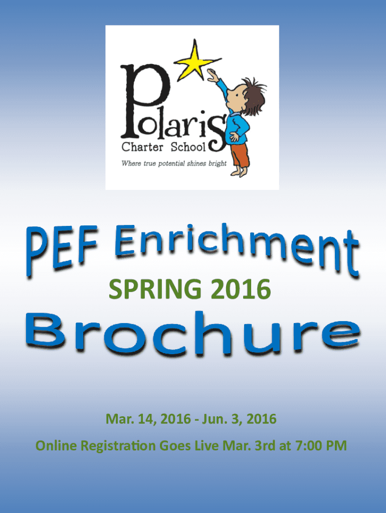 SPRING 2016Mar. 14, 2016 Jun. 3, 2016 Online Registration Goes Live Mar. 3rd at 7:00 Pair Polaris Parents, The PEF seeks to enrich the curriculum at Polaris through planning and helping to fund: Field
