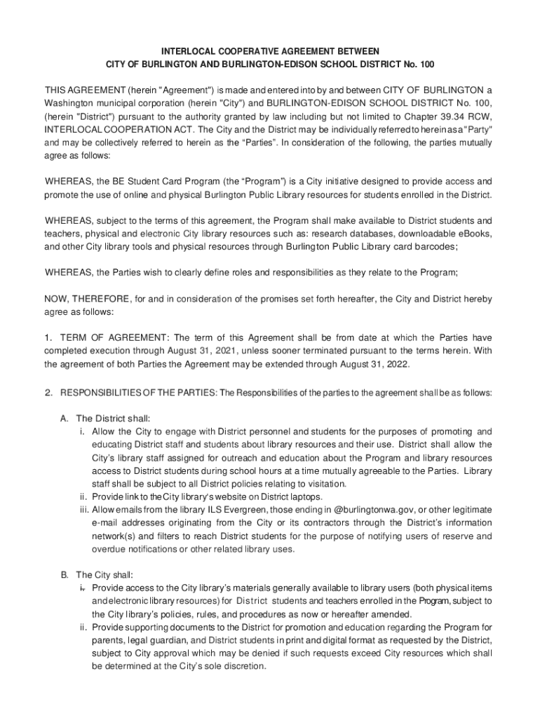 INTERLOCAL COOPERATIVE AGREEMENT BETWEEN CITY OF BURLINGTON AND BURLINGTONEDISON SCHOOL DISTRICT No. 100 THIS AGREEMENT (herein \"Agreement\") is made and entered into by and between CITY OF BURLINGTON