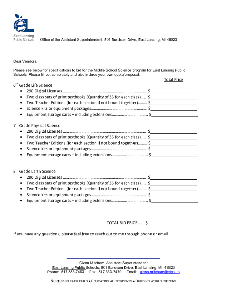 Office of the Assistant Superintendent, 501 Burch am Drive, East Lansing, MI 48823Dear Vendors, Please see below for specifications to bid for the Middle School Science program for East Lansing Public