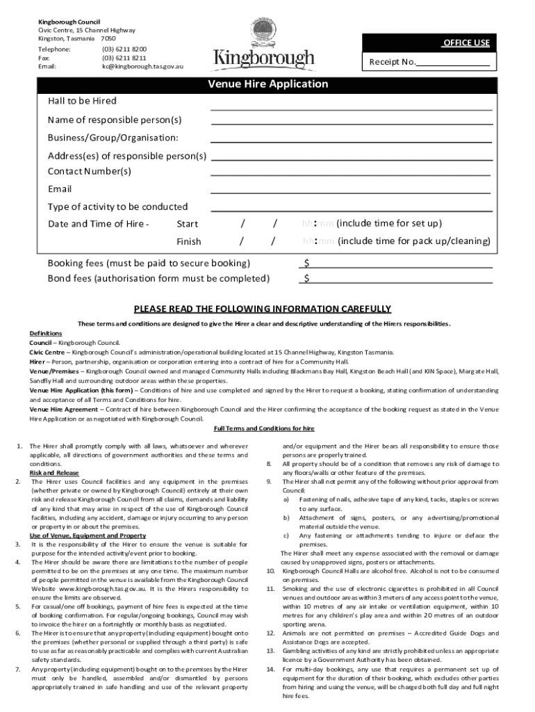 King borough Council Civic Center, 15 Channel Highway Kingston, Tasmania 7050 Telephone: Fax: Email:OFFICE USE(03) 6211 8200 (03) 6211 8211 kc@kingborough.tas.gov.auReceipt No. Venue Hire Application