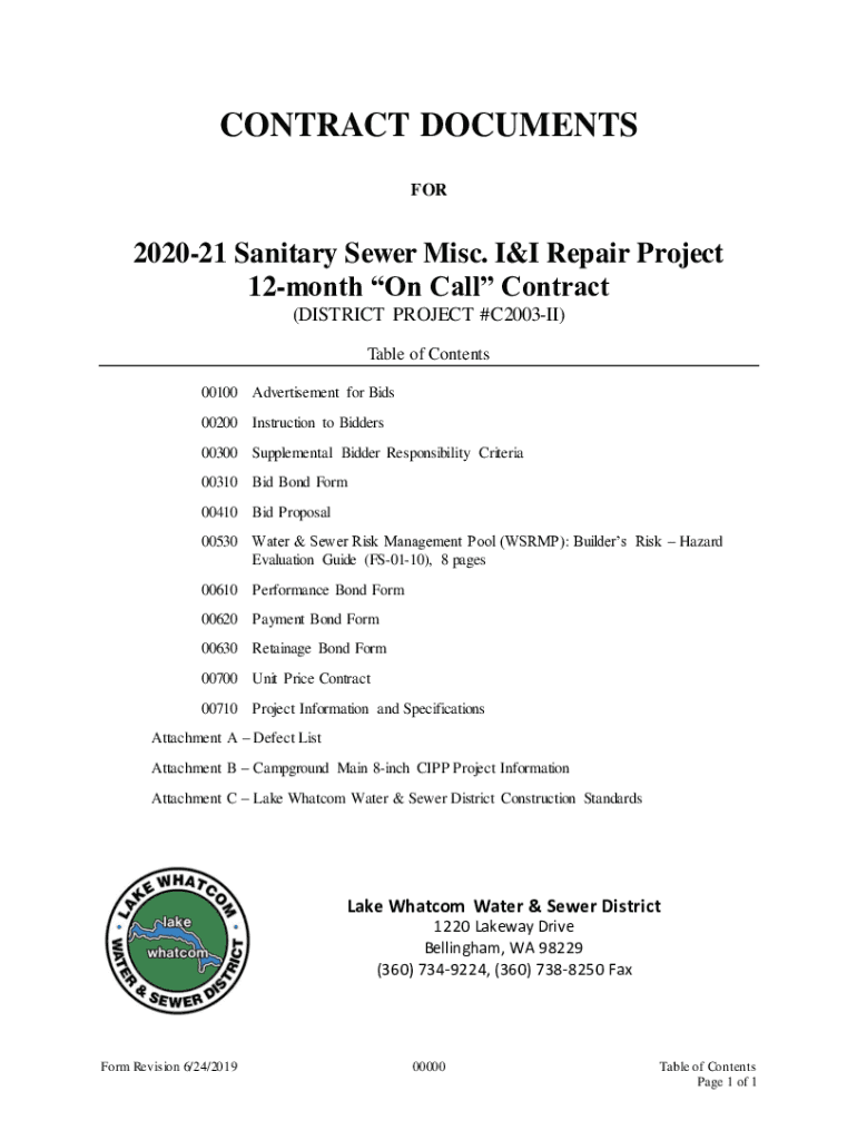 CONTRACT DOCUMENTS FOR202021 Sanitary Sewer Misc. I&I Repair Project 12month On Call Contract (DISTRICT PROJECT #C2003II) Table of Contents 00100 Advertisement for Bids 00200 Instruction to Bidders