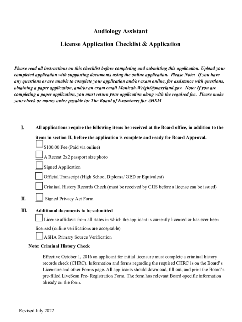 Get the free Audiology Assistant License Application ... - Maryland.gov