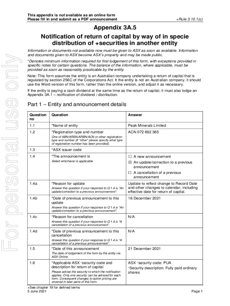 Get the free Appendix 3A.5 Notification of return of capital by way of in ...