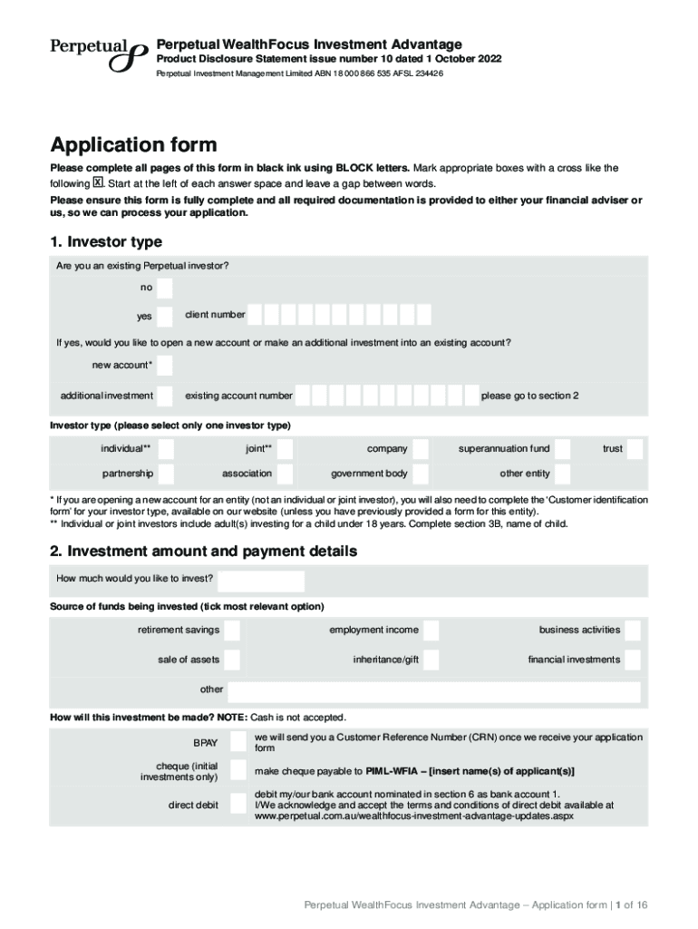 Perpetual WealthFocus Investment Advantage Product Disclosure Statement issue number 10 dated 1 October 2022 Perpetual Investment Management Limited ABN 18 000 866 535 ADSL 234426Application form