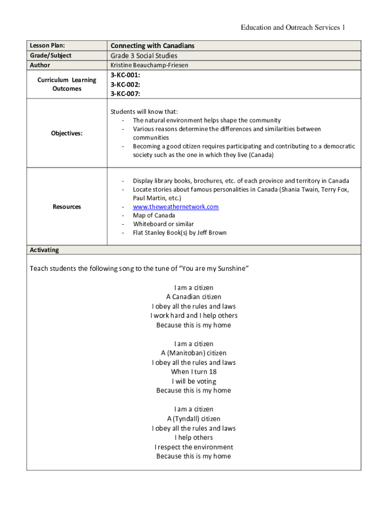 Education and Outreach Services 1 Lesson Plan: Grade/Subject Author Curriculum Learning OutcomesObjectives:Connecting with Canadians Grade 3 Social Studies Kristine BeauchampFriesen3KC001: 3KC002: