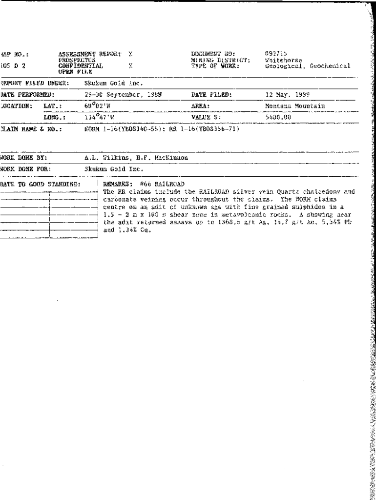 (AD NO,:ASSESSMENT REPORTXPROSPECTUS [05 D 2CONFIDENTIAL OPEN FILEXDOCUMENT NO: MINING DISTRICT: TYPE OF WORK:092715 WhitehorseGeological, GeochemicalEPORT FILED UNDER:Skukum Gold Inc.)ATE PERFORMED:2930
