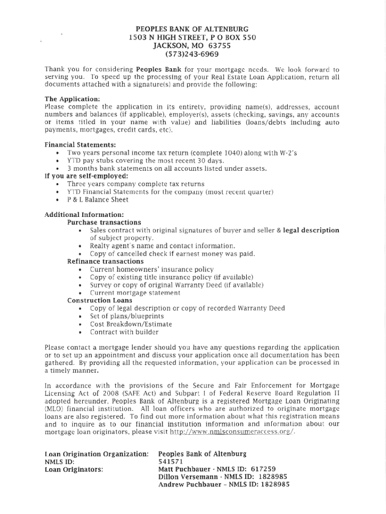 PEOPLES BANK OF ALTENBURGI5O3 N HIGH STREET, P O BOX 550 JACKSON, MO 63755 (s 73)2436969 Thank you for considering Peoples Bank for your mortgage needs. We look forward to serving you. To speed up