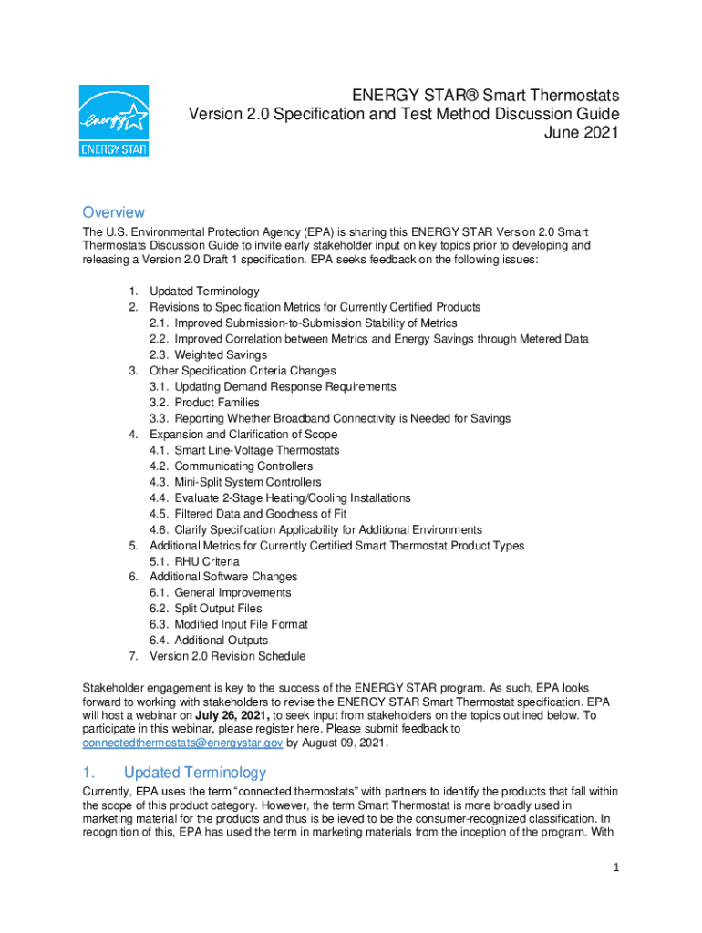 ENERGY STAR Smart Thermostats Version 2.0 Specification and Test Method Discussion Guide June 2021Overview The U.S. Environmental Protection Agency (EPA) is sharing this ENERGY STAR Version 2.0 Smart