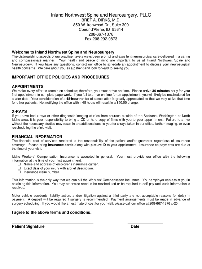 Inland Northwest Spine and Neurosurgery, LLC BRET A. DIRKS, M.D. 850 W. Ironwood Dr., Suite 300 Four Darlene, ID 83814 2086671376 Fax 2082920873 Welcome to Inland Northwest Spine and Neurosurgery