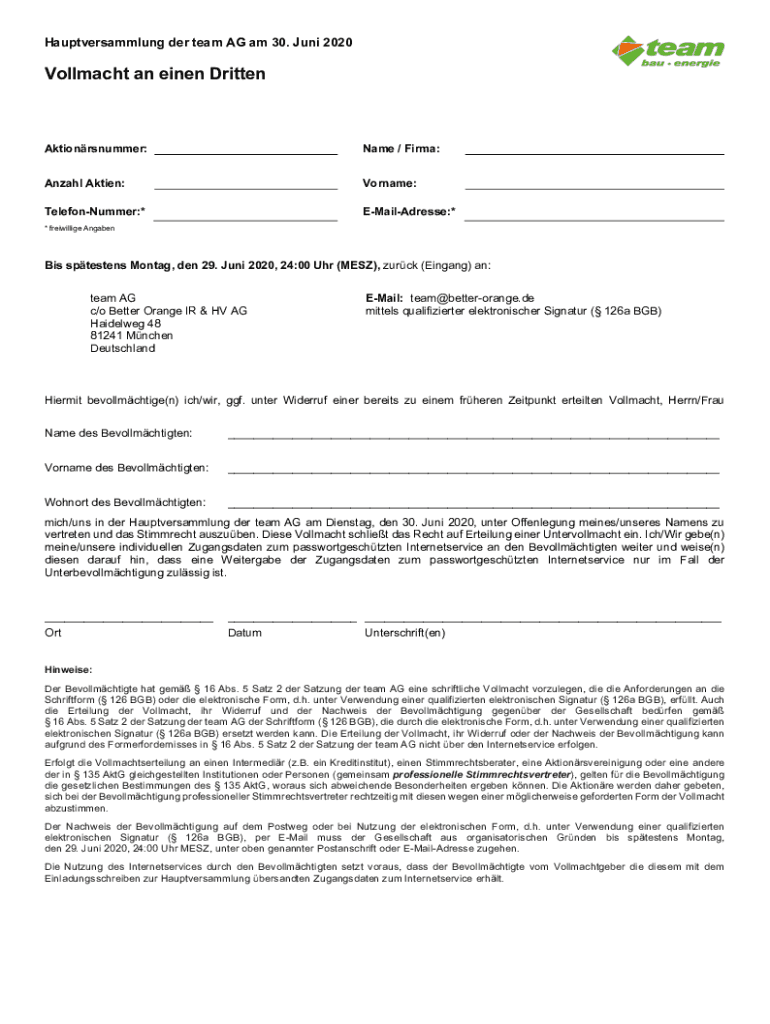 Hauptversammlung her team AG am 30. June 2020Vollmacht an linen DrittenAktionrsnummer:Name / Firm:Anzac Attain:Surname:TelefonNummer:*EMailAdresse:** freiwillige AngabenBis Stevens Montag, den 29.
