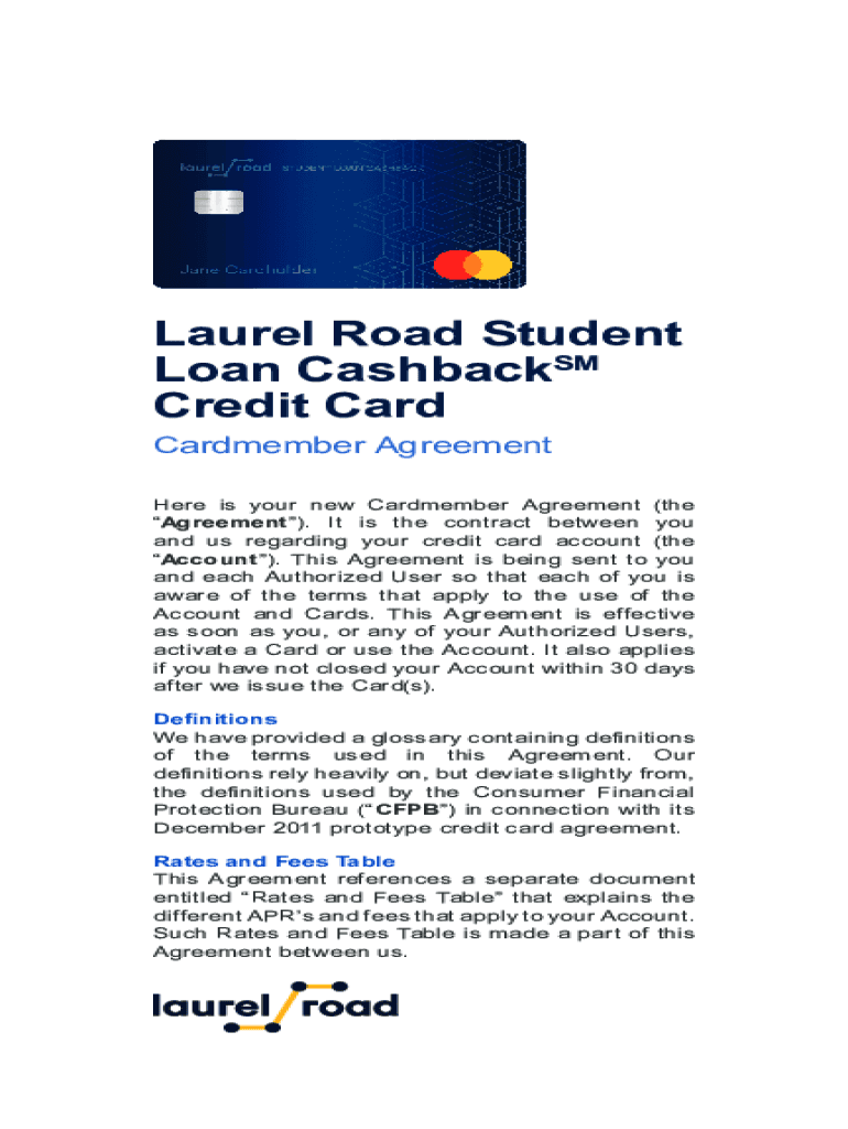 Laurel Road Student Loan Cashback SM Credit Card Card member AgreementHere is your new Card member Agreement (the Agreement). It is the contract between you and us regarding your credit card account