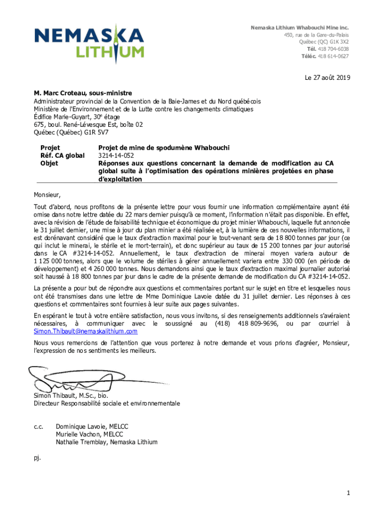 Nemaska Lithium Whabouchi Mine inc. 450, rue de la GareduPalais Qubec (QC) G1K 3X2 Tl. 418 7046038 Tlc. 418 6140627Le 27 aot 2019 M. Marc Croteau, sousministre Administrateur provincial de la Convention