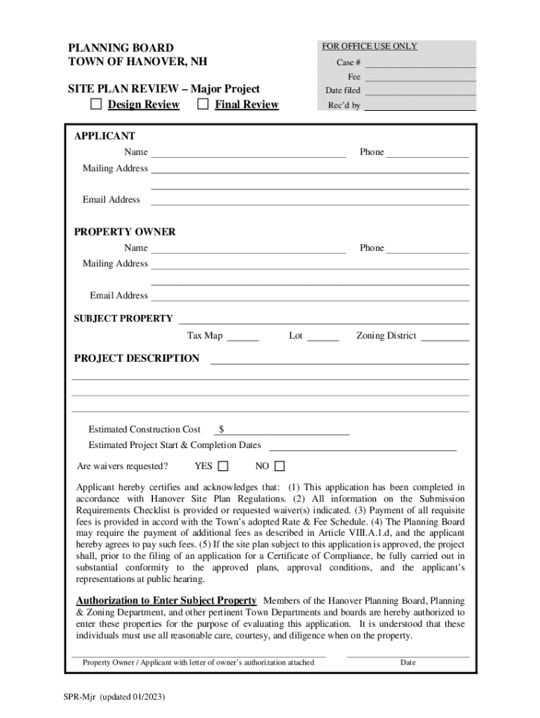 FOR OFFICE USE ONLYPLANNING BOARD TOWN OF HANOVER, NH Case # FeeS ITE PLAN REVIEW Major Project Design Review Final Revalidate filed Recd applicant NamePhoneMailing Address Email AddressPROPERTY OWNER